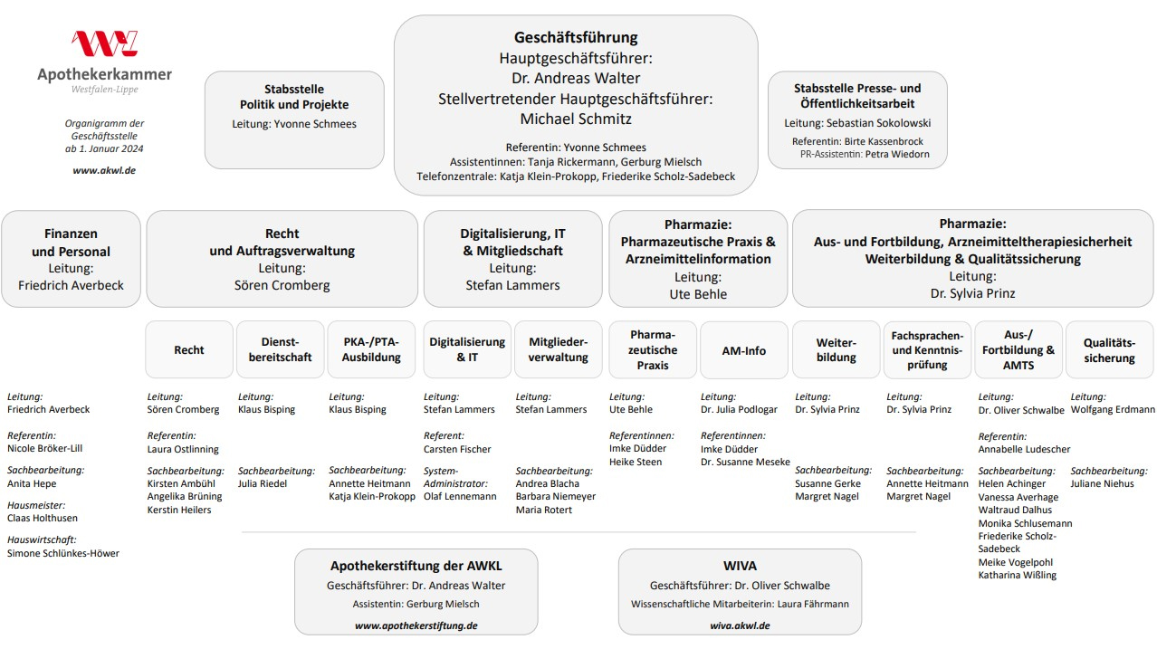 Unser Organigramm verschafft Ihnen einen schnellen und leicht nachvollziehbaren Überblick über die Verantwortlichkeiten und Strukturen innerhalb der Apothekerkammer Westfalen-Lippe.