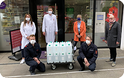(Münster, 18. Mai 2020) In der Corona-Krise versorgen die Apothekerinnen und Apotheker in Münster den Krisenstab der Stadt Münster kostenfrei mit Handdesinfektionsmitteln. Gerade jetzt werden diese Mittel an vielen Stellen, zum Beispiel in Obdachloseneinrichtungen, Krisenberatungsstellen, Kitas und Schulen, dringend gebraucht. Möglich gemacht hat diese Initiative eine großzügige Spende der Kornbrennerei August Schierhölter. Die Kornbrennerei aus Glandorf stellte im April und Mai 600 Liter Ethanol bereit, das als Ausgangsstoff für die Herstellung von Handdesinfektionsmitteln im Apothekenlabor erforderlich ist.