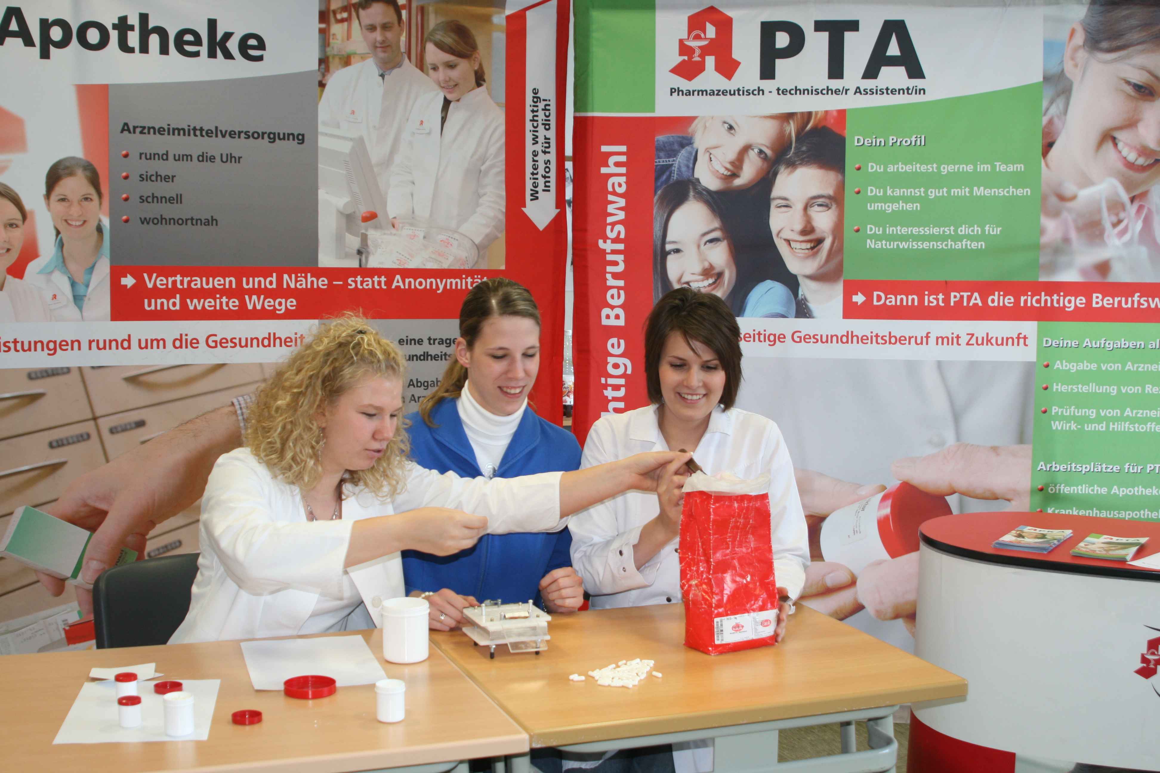 Wer über die Fachoberschulreife verfügt, kann sich an einer Lehranstalt für pharmazeutisch-technische Assistenten (PTA) bewerben. Hier umfasst der zweijährige Lehrgang theoretische und praktische Unterrichtsfächer und spiegelt die enorme Vielfalt des Berufsbildes wider. „Auf dem Lehrplan stehen Allgemeine und pharmazeutische Chemie, Arzneimittelkunde, Arzneimittelherstellung und Botanik, aber auch Gift-, Gesetzes-, Wirtschafts- und Sozialkunde", erläutert Overwiening. In der unterrichtsfreien Zeit vermittelt ein vierwöchiges Praktikum in der Apotheke erste Einblicke in den Betrieb. Auf die zwei Jahre in der PTA-Lehranstalt folgt ein sechsmonatiges, bezahltes Praktikum.