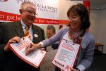 Gabriele Regina Overwiening (Präsidentin der Apothekerkammer Westfalen-Lippe) und Johannes Hermes (Stellvertretender Vorsitzender des Apothekerverbandes Westfalen-Lippe) mit der symbolischen Streichliste der Leistungen, die durch das Arzneimittelmarktneuordnungsgesetz (AMNOG) gefährdet sind.