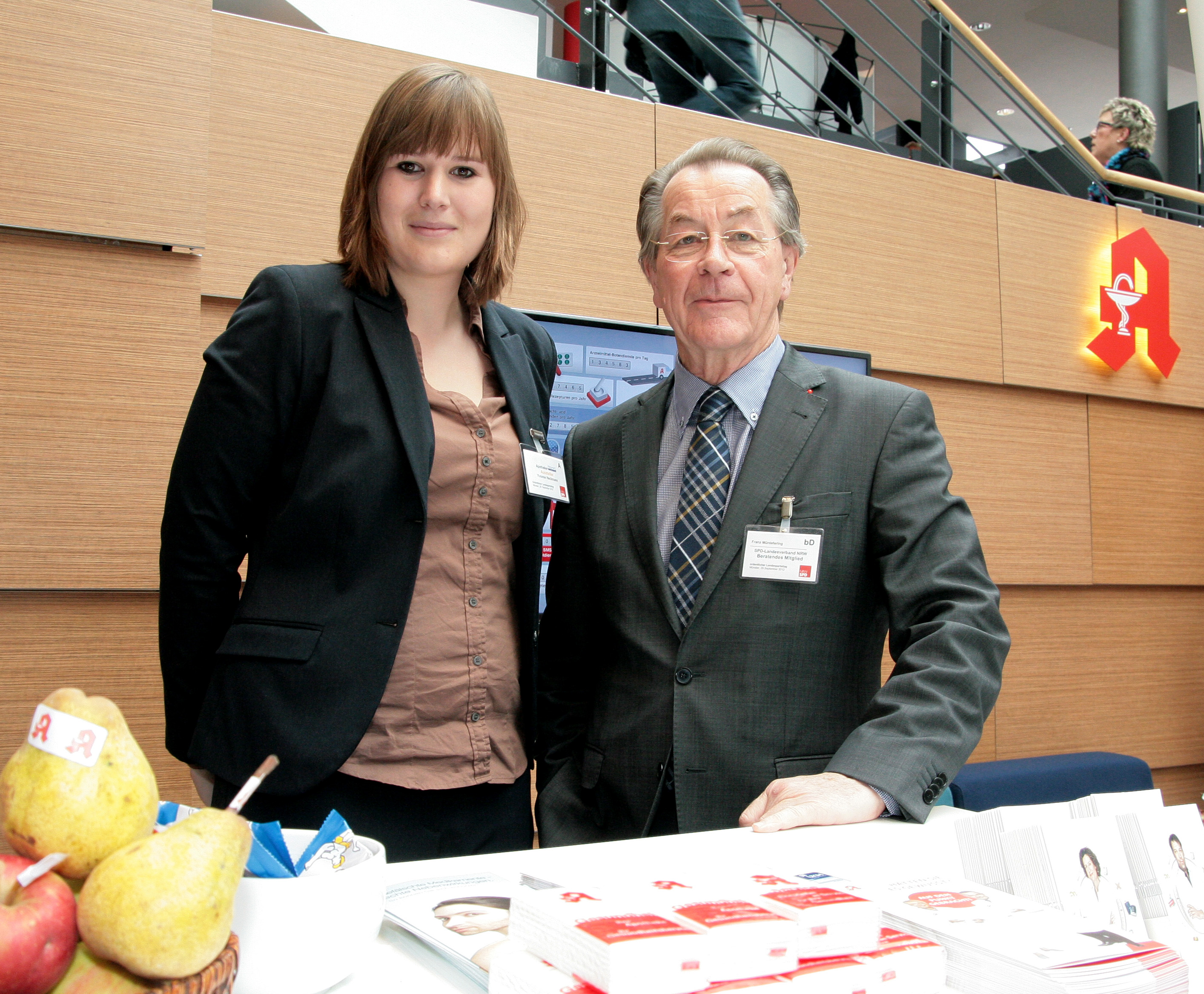 Viele der Delegierten und Gäste nutzten die Chance, sich am Apothekerstand nicht nur mit Vitaminen in Form von Äpfeln und Birnen, sondern auch mit Informationen rund um die aktuelle Lage und die Leistungen der Apotheke zu versorgen. Der Andrang war groß - nicht nur von Politikern aus der Basis und den Kreisen und Städten, auch bekannte Gesichter kamen zum Small-Talk. So hatte Yvonne Heckmann, Politikreferentin der Kammer die Chance zum Gespräch mit Franz Müntefering, der aus seiner Zeit als NRW-Gesundheitsminister in den Jahren 1992 bis 1995 noch bestens im Thema steht.