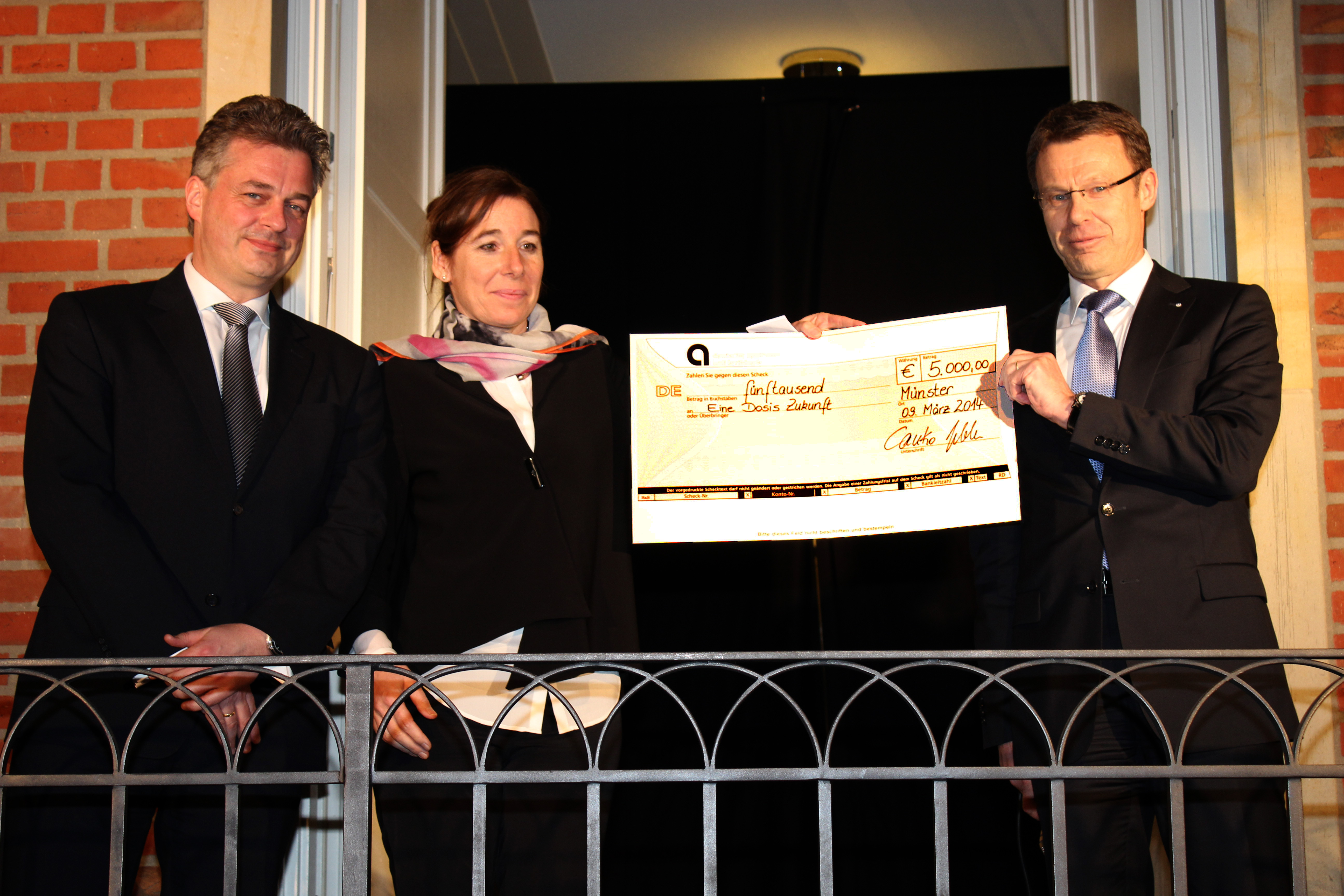 Seit Beginn an ist die Deutsche Apotheker- und Ärztebank (apoBank) Partner des Hilfsprojektes. Jörg Peter Cauko aus der Zentrale des Geldinstitutes in Düsseldorf und Franz-Josef Gebker, Leiter der Filiale in Münster, überreichten am Sonntag Kammerpräsidentin Overwiening einen symbolischen Spendenscheck über 5.000 Euro.  "Wir freuen uns, dass wir mit unserem Engagement dazu beitragen können, die medizinische Versorgung in den Slums zu verbessern und den Kindern eine gesunde Zukunft zu schenken", so Gebker. „Dieses wichtige Projekt haben wir in den letzten Jahren sehr gerne unterstützt und werden dies auch gerne weiter tun.“