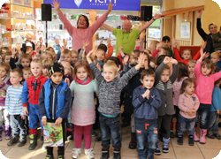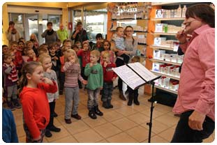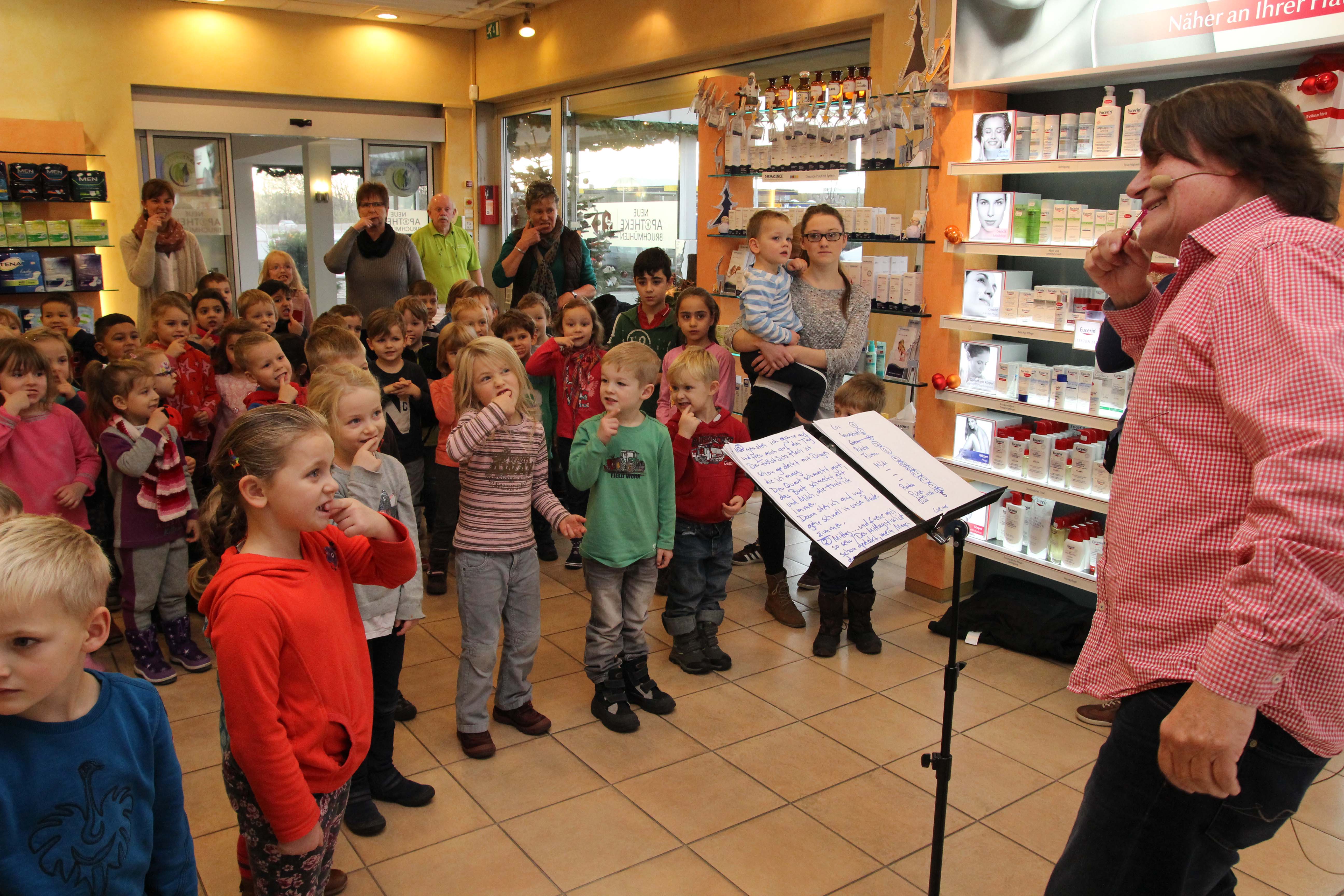 (Münster, 3. Dezember 2015) Präventions-CDs des Kinderlieder-Stars Detlev Jöcker sind in vielen westfälisch-lippischen Apotheken zu bekommen. Im Rahmen einer Charity-Aktion gab der Liedermacher heute ein Live-Konzert in Rödinghausen – und zwar in der Neuen Apotheke Bruchmühlen von Heinz-Peter Wittmann. Der Apotheker hatte das Konzert bei einer Benefiz-Gala im Frühjahr in Münster ersteigert. „Als ich von der CD und der Auktion hörte, sah ich die Chance, den Kinderlieder-Star in unser schönes Rödinghausen zu holen und den Kindern aus benachbarten Kindergärten und dem Flüchtlingsheim damit eine Freude zu machen“, erklärte Wittmann, Vorstandsmitglied der Apothekerkammer Westfalen-Lippe und Sprecher der Apothekerschaft im Kreis Herford. „Und wie könnte Integration von Flüchtlingen besser funktionieren, als wenn die Kinder gemeinsam singen und tanzen?“ Rund 90 Kinder (Kita Kuckucksnest, Oberlin Kindergarten und Flüchtlingsunterkunft) „enterten“ seine Apotheke, tanzten und sangen gemeinsam mit Jöcker.