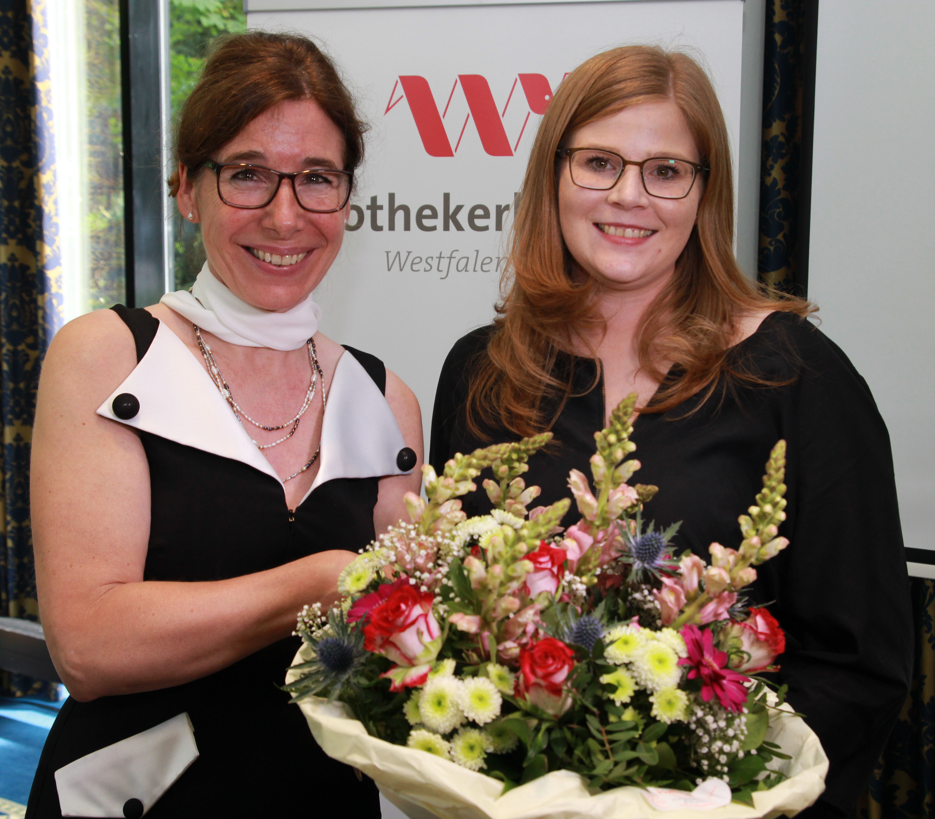 Kammerpräsidentin und Vorsitzende der Apothekerstiftung Westfalen-Lippe Gabriele Regina Overwiening (links) zeichnete Corinna Böltner für ihre Projektarbeit im Rahmen der Weiterbildung mit dem Stiftungspreis aus.