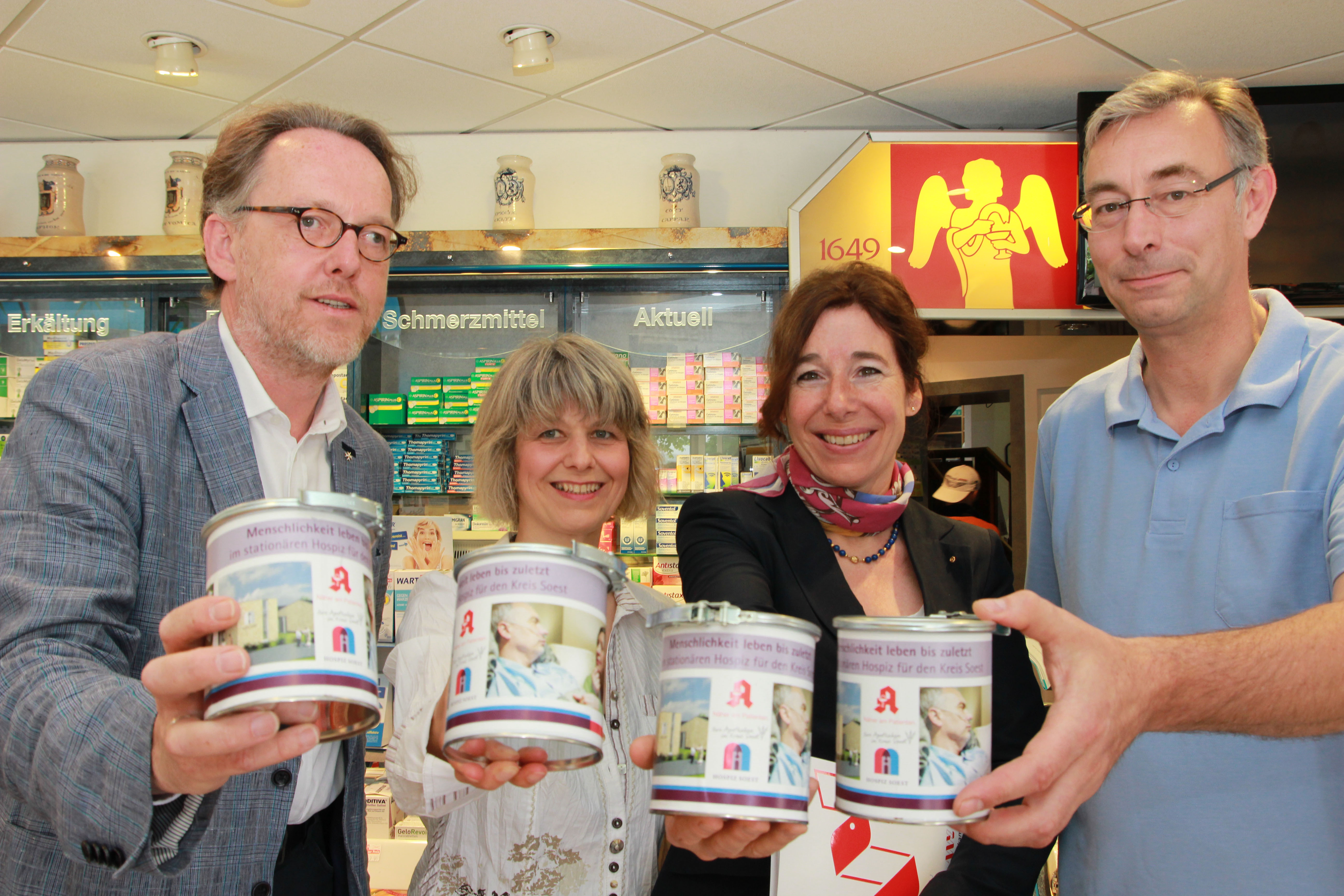 Insgesamt 28 Apotheken aus dem gesamten Kreis Soest sammeln seit heute Spenden für das Christliche Hospiz Soest und engagieren sich damit für den Bau des ersten Hospizes im Kreis Soest überhaupt. „Es ist wichtig, dass Menschen auch im Kreis Soest die Möglichkeit haben, selbstbestimmt, würdig und gut versorgt dort zu sterben, wo der Lebensmittelpunkt ist, im Kreis der Familie“, betont Dr. Horst Heidel, Kreisvertrauensapotheker und Initiator der apothekerlichen Spendenaktion. In seiner Engel-Apotheke am Markt fiel heute der Startschuss. „Als Apotheker versorgen wir die Menschen vor Ort ein Leben lang mit Arzneimitteln und sind erste Anlaufstelle in Gesundheitsfragen – und das rund um die Uhr. Da war mir klar, dass wir uns vor Ort auch in dieser Angelegenheit engagieren müssen“, erklärt der Apotheker seine Beweggründe, warum er und viele andere Apothekerinnen und Apotheker im Kreis ihren Beitrag dazu leisten wollen, das Hospiz zu errichten.
