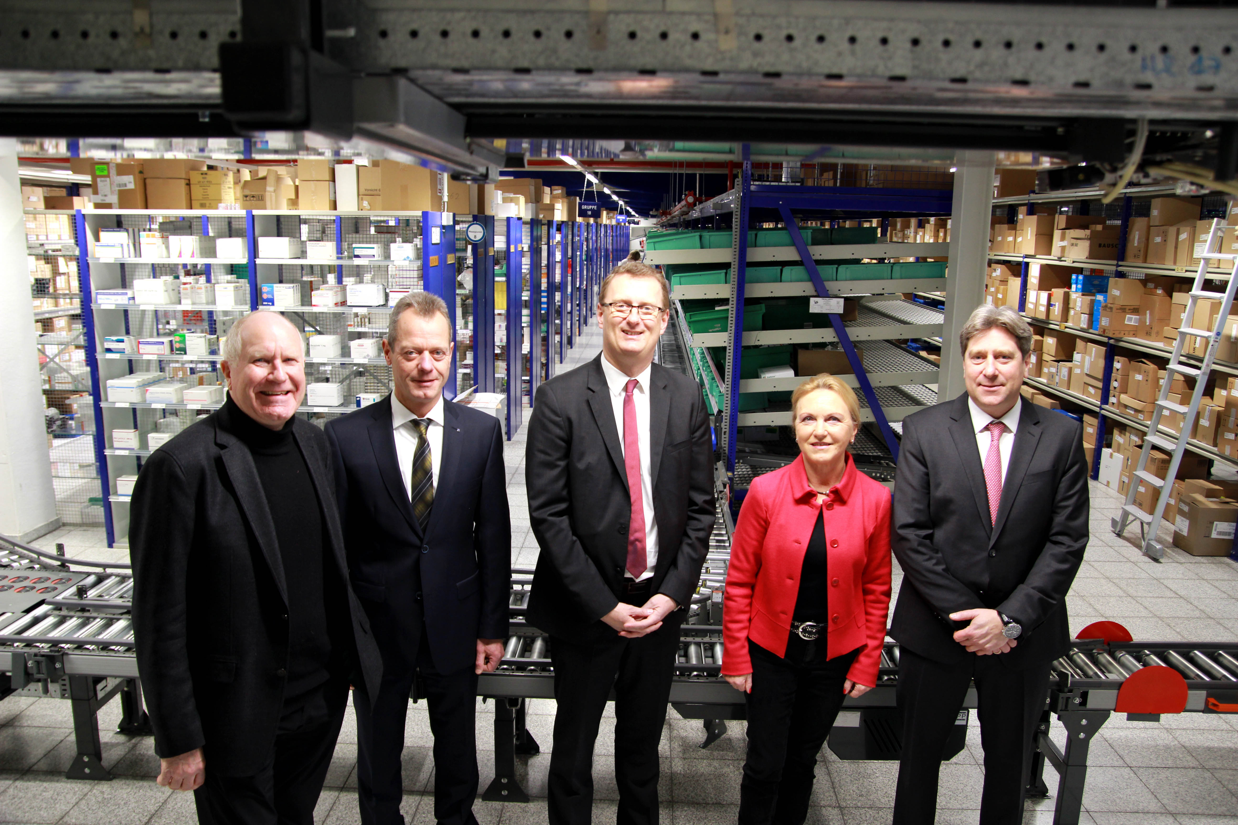 Jedes gewünschte Arzneimittel liefert die NOWEDA binnen zwei Stunden an die Apotheke aus. Einen Blick hinter die Kulissen des genossenschaftlichen Großhändlers warf MdB Oliver Kaczmarek (Bildmitte). Hier gemeinsam mit Hans-Günter Friese, Betriebsleiter Guido Ihlbrock, Margarete Tautges und Vertriebsleiter Klaus Rüth (von links).
