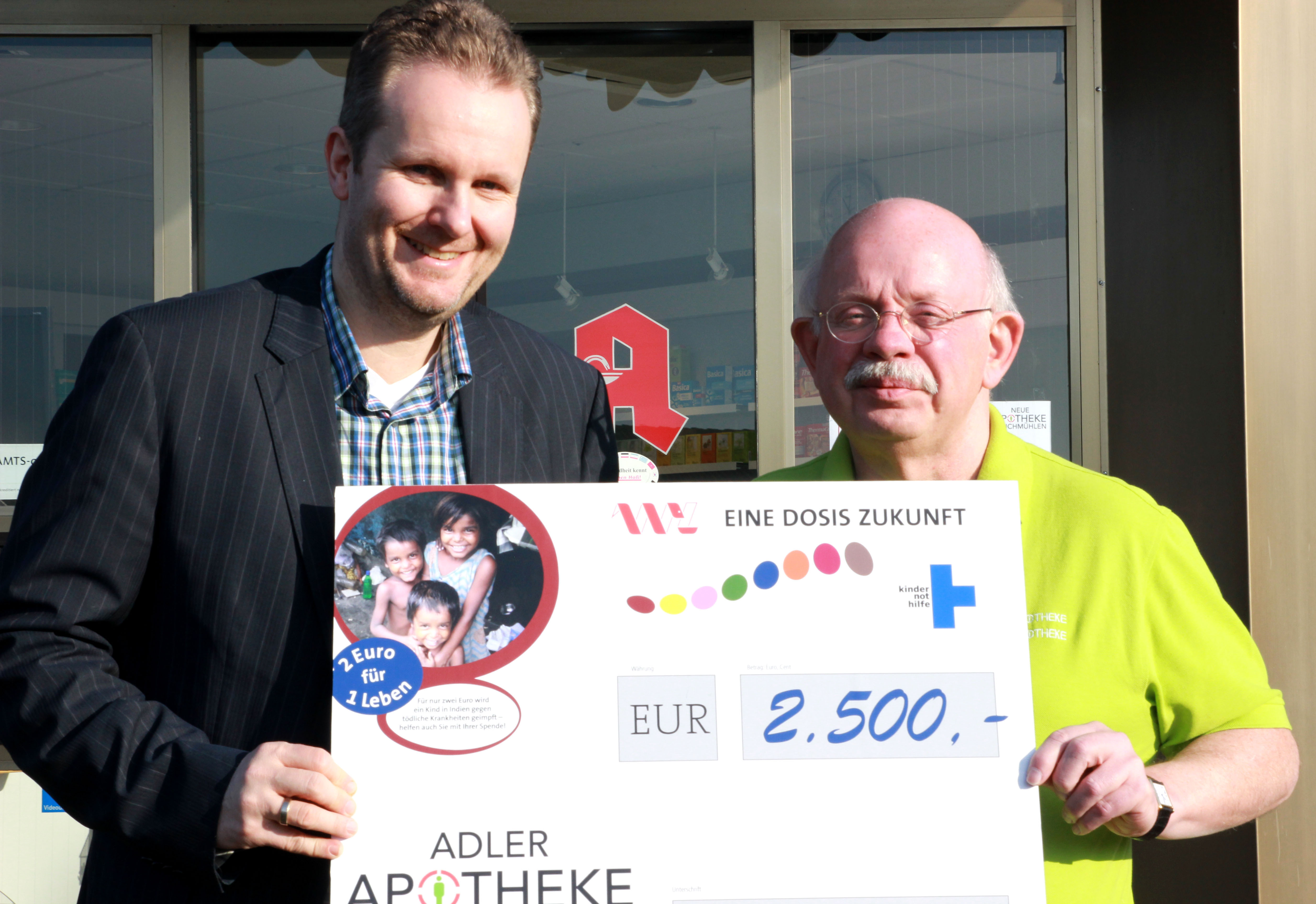 Seit 2009 unterstützen die Apotheker in Westfalen-Lippe gemeinsam mit der Kindernothilfe die gesundheitliche Versorgung von über 50.000 Kindern in den Slums von Kalkutta. „Eine Dosis Zukunft“ heißt das Hilfsprojekt, für das bis Donnertagmittag exakt 247.646 Euro zusammengekommen waren. Apotheker Heinz-Peter Wittmann aus Rödinghausen sorgt jetzt dafür, dass die Viertelmillion-Euro-Grenze überschritten wird. Denn durch den Verzicht auf Weihnachtskarten und eine Sammelaktion in seinen beiden Apotheken in Rödinghausen und Bruchmühlen hat das Vorstandsmitglied der Apothekerkammer Westfalen-Lippe eine stolze Summe von 2.500 Euro zusammenbekommen. Gestern übergab Wittmann den Scheck an Michael Schmitz, Geschäftsführer Kommunikation der Apothekerkammer und verantwortlich für das Hilfsprojekt.