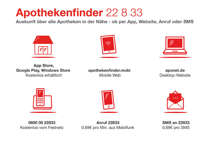 • Nutzung der “Apothekenfinder“-App für Apple -, Android - und Windows 8 Smartphones und Tablets sowie Windows 8.1 PCs. (Kostenloser Download im App Store, GooglePlay sowie im Windows Store)