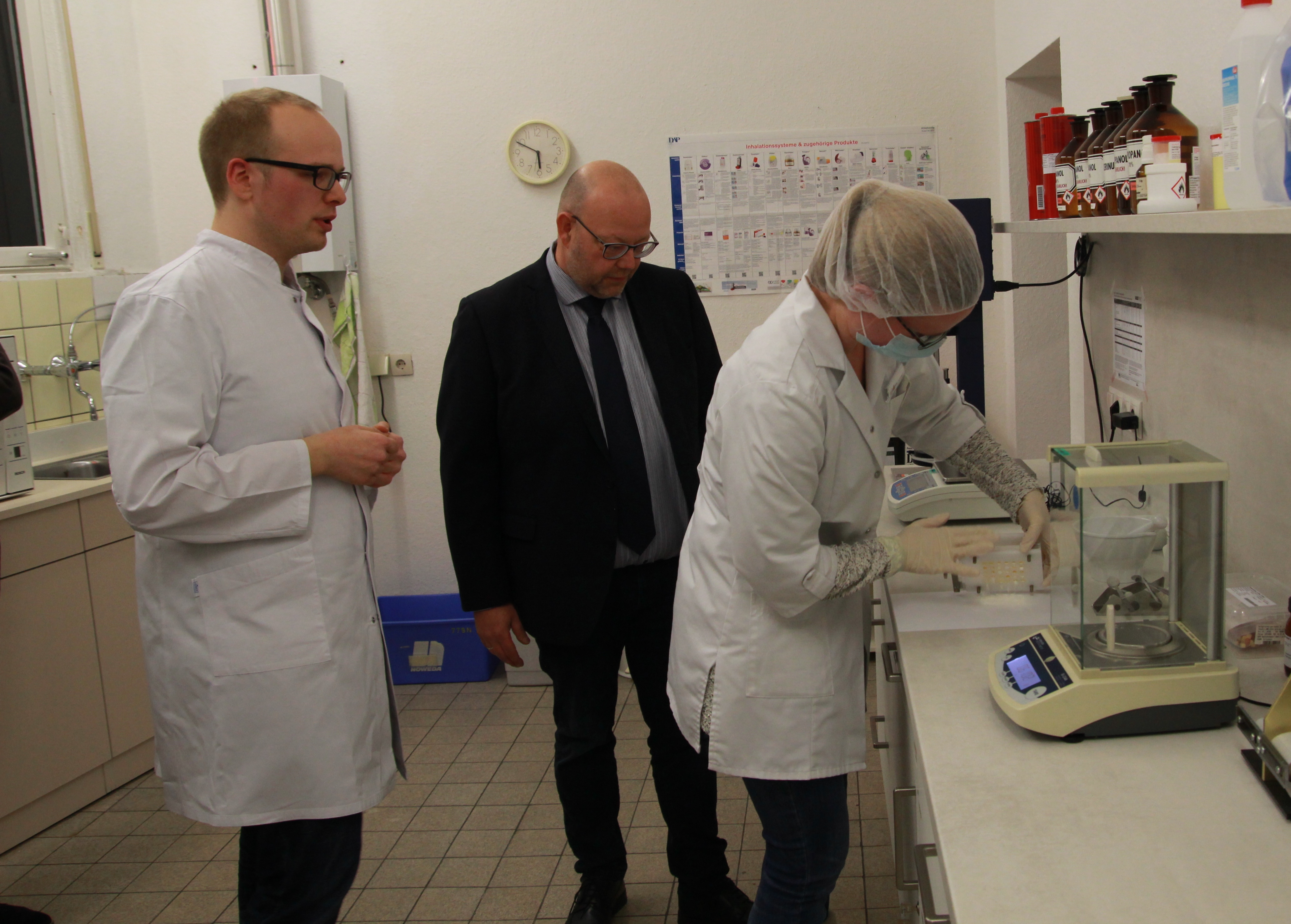 Während des gut einstündigen Treffens warf der Politiker einen Blick in das sogenannte „Backoffice“ und verschaffte sich ein Bild von der täglichen Arbeit in einer Apotheke. Zuerst führte der Weg in die Rezepturherstellung. „Hinter einer Apotheke steckt viel mehr, als die bloße Arzneimittelabgabe. Hier in unserer Rezeptur stellen wir Salben oder Kapseln insbesondere für Kleinkinder passgenau her“, erläuterte Filialleiter Dr. Hannes Müller. Weiter zeigte er dem FDP-Abgeordneten das Notdienstzimmer, den Handverkaufstisch und auch das Beratungszimmer, das für vertrauliche Gespräche zur Verfügung steht.