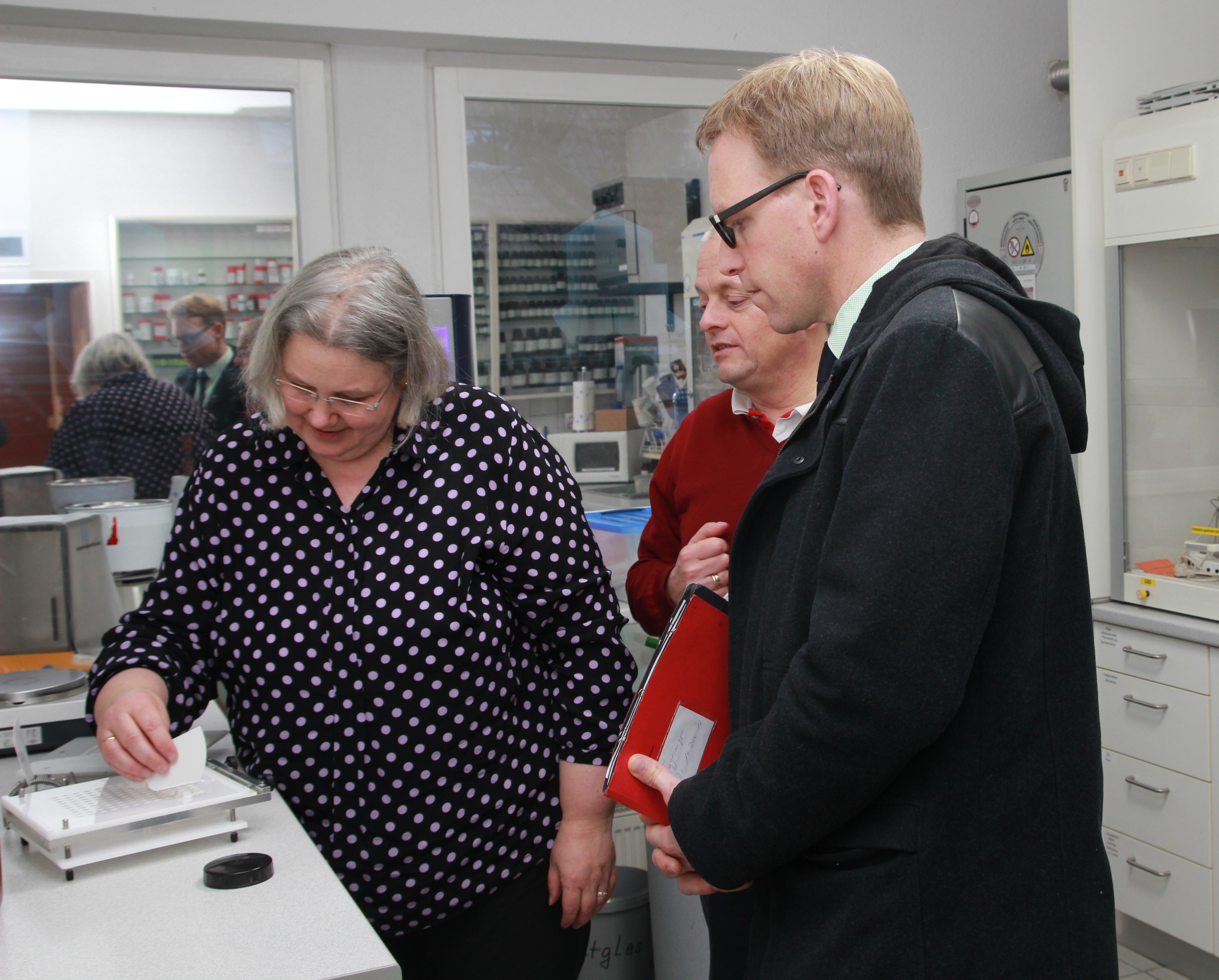 Durch ein ausgeprägtes Logistiknetz, das die Apotheke dreimal täglich beliefert, ist nahezu jedes Arzneimittel innerhalb weniger Stunden vor Ort – oder per Botendienst beim Patienten zu Hause. Aber auch individuelle Rezepturen werden in jeder Apotheke vor Ort angefertigt. „Für Kinder, aber auch für andere Patienten fertigen wir häufig selbst passende Rezepturen an. Erst kürzlich haben wir farblich unterschiedliche Kapseln für ein Kleinkind hergestellt. So wusste die Mutter, welche Kapsel zu welcher Tageszeit eingenommen werden muss.“ Wie eine Kapselherstellung im Labor funktioniert und wie aufwendig die Protokollierung dazu ist, zeigte Apothekerin Sabine Barrmeyer dem Bundestagsabgeordneten.
