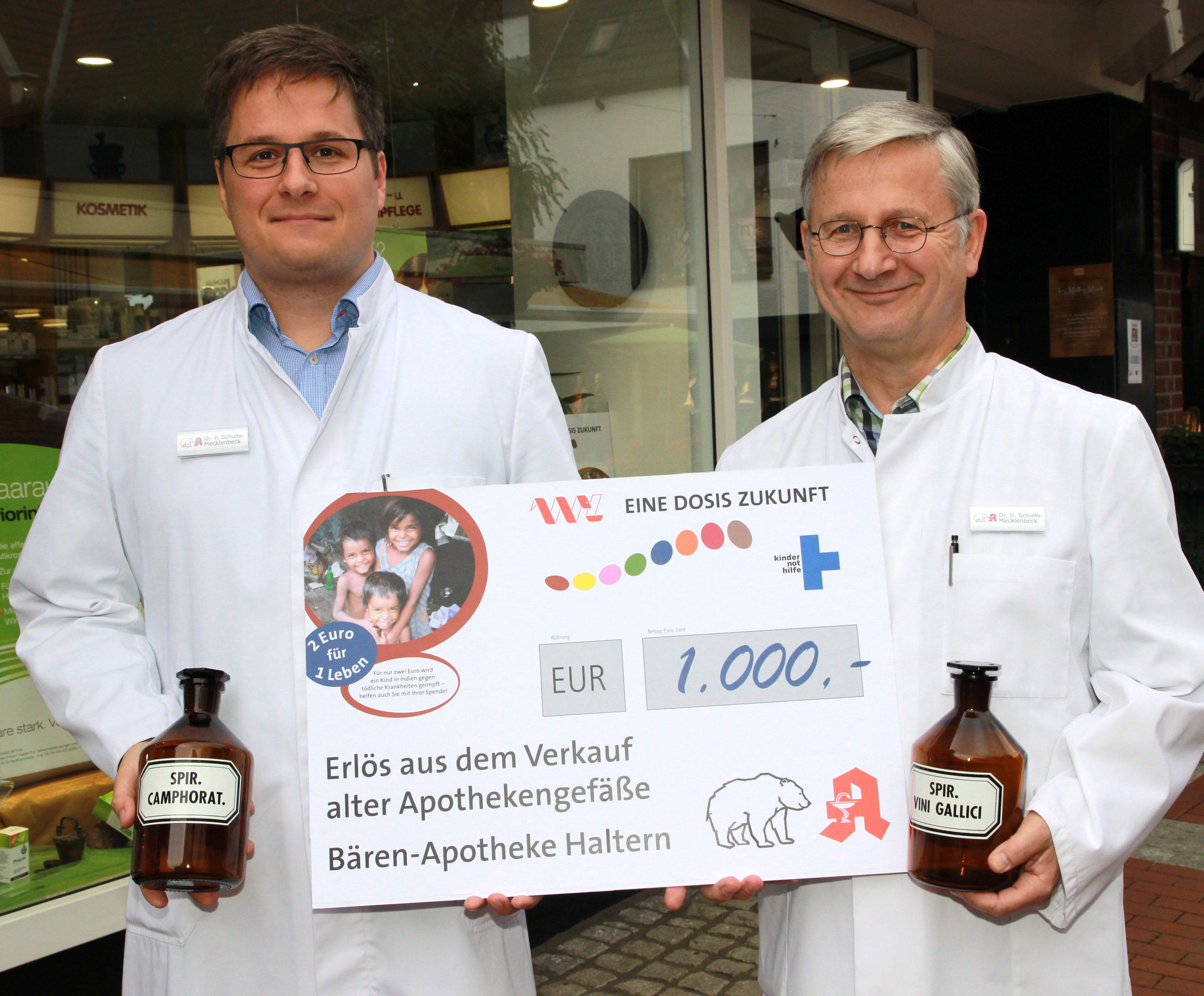 Stolze 1.000 Euro kamen im Herbst durch den Verkauf historischer Apothekengefäße in der Halterner Bären-Apotheke zusammen. Darüber freuten sich die Apotheker Dr. Dirk Schulte-Mecklenbeck (re.) und Dr. Philipp Schulte-Mecklenbeck. Foto: AKWL/Sokolowski