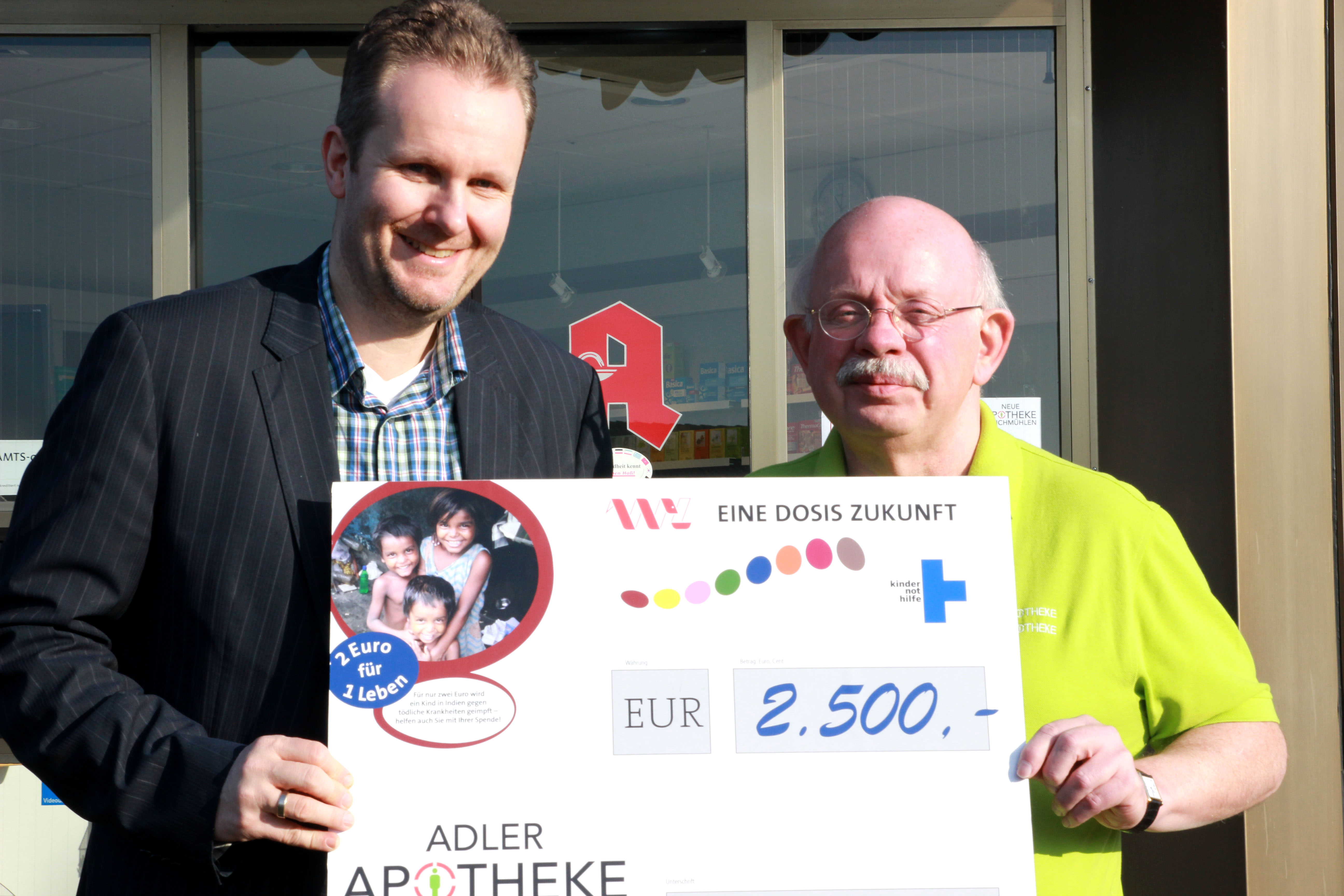 Das Herzstück der Aktion „Eine Dosis Zukunft“ bilden nach wie vor Spendensammlungen in den Apotheken: In 350 westfälisch-lippischen Apotheken sind Informationsflyer und Spendenboxen zu finden – Tendenz steigend. Über den aktuellen Stand informiert ein Spendenbarometer auf der Aktionshomepage www.eine-dosis-zukunft.de. Seit 2009 haben sich zudem viele prominente Paten der Kindernothilfe wie Moderator Dieter Kürten, „Wetterfee“ Claudia Kleinert, die Schauspieler Heike Klossund Dietrich Mattausch und Musiker Thomas Godoj in den Dienst der guten Sache gestellt – unter anderem im Rahmen von Spenden-Galas und Lesungen. Ende 2014 erschien zudem die Benefiz-CD „Ich bleib‘ gesund“ von Kinderliedermacher Detlev Jöcker, die in vielen Apotheken erhältlich ist.