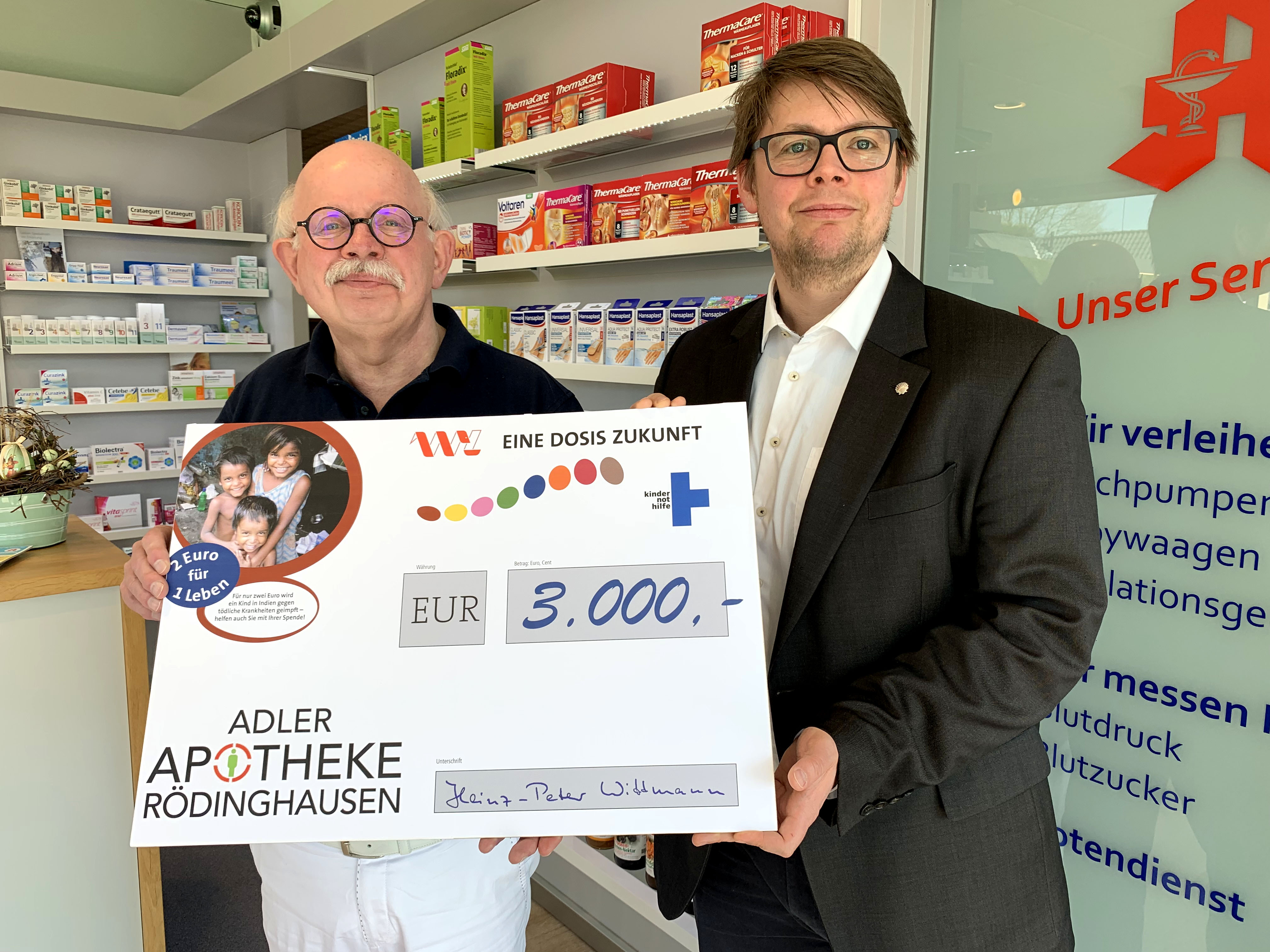 (Münster/Rödinghausen, 11. April 2019) Seit 2009 unterstützen die Apothekerinnen und Apotheker in Westfalen-Lippe gemeinsam mit der Kindernothilfe die gesundheitliche Versorgung der Kinder in den Slums von Kalkutta. „Eine Dosis Zukunft“ heißt das Hilfsprojekt, für das bis Donnerstagmittag exakt 344.252 Euro zusammengekommen waren. Apotheker Heinz-Peter Wittmann aus Rödinghausen sorgt jetzt dafür, dass die Spendensumme weiter steigt: Denn durch den Verzicht auf Kalender und kleine Kundengeschenke in seinen beiden Apotheken in Rödinghausen und Bruchmühlen hat das Vorstandsmitglied der Apothekerkammer Westfalen-Lippe eine stolze Summe von 3.000 Euro zusammenbekommen. Gestern übergab Wittmann den Scheck an Sebastian Sokolowski, Pressesprecher der Apothekerkammer Westfalen-Lippe.