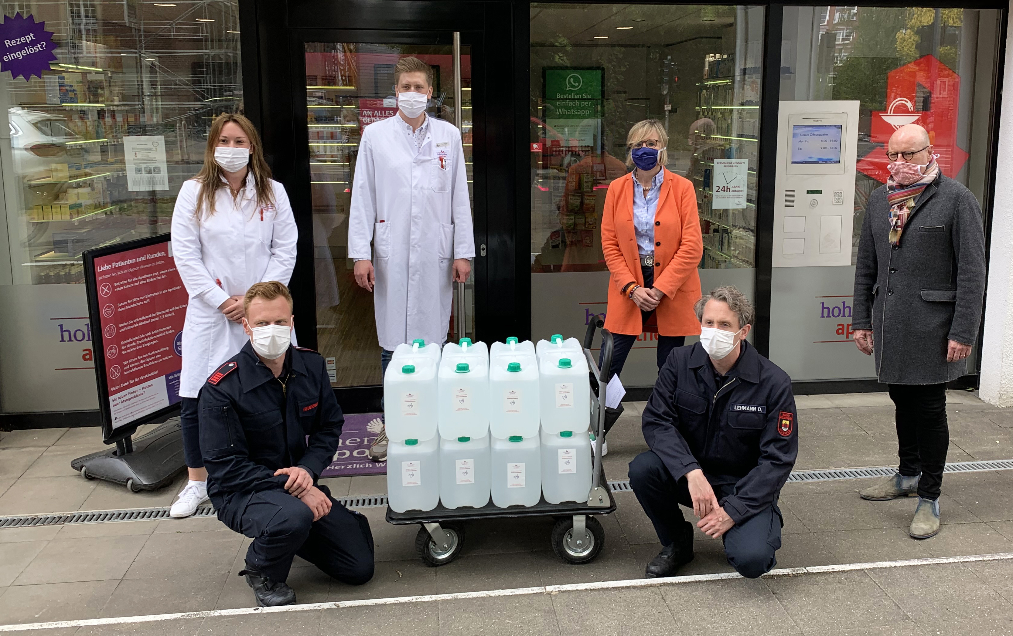 Verarbeitet hat dieses dann ein vierköpfiges Team in der Hohenzollern-Apotheke rund um die Sprecherin der münsterischen Apothekerinnen und Apotheker, Angelika Plassmann – und zwar in der Freizeit. Angesichts der Menge war einiges an ehrenamtlichem Aufwand dafür erforderlich. Etappenweise wurde das Desinfektionsmittel von der münsterischen Feuerwehr abgeholt, die als Akteur im Krisenstab die Verteilung innerhalb der Stadt Münster sicherstellt. Bei Abholung der vorerst letzten Lieferung gesellte sich auch Münsters Oberbürgermeister Markus Lewe hinzu. Er dankte Angelika Plassmann und ihrem Team für das großartige Engagement und stelle heraus, wie wichtig die Kompetenz der Apotheker vor Ort für die Gesellschaft sei: „Sie sind wohnortnah für die Menschen da und haben in den letzten Monaten einen unverzichtbaren Beitrag zur Krisenresilienz geleistet. Dafür bin ich allen Apotheken-Teams in der Stadt sehr dankbar“, so Markus Lewe. Schon zuvor hatte sich die Apothekerschaft bei weiteren Projekten eingebracht, wie der Verteilung der sogenannten „Community-Masken“ und bei der Unterstützung des Corona-Fonds der Universität Münster.