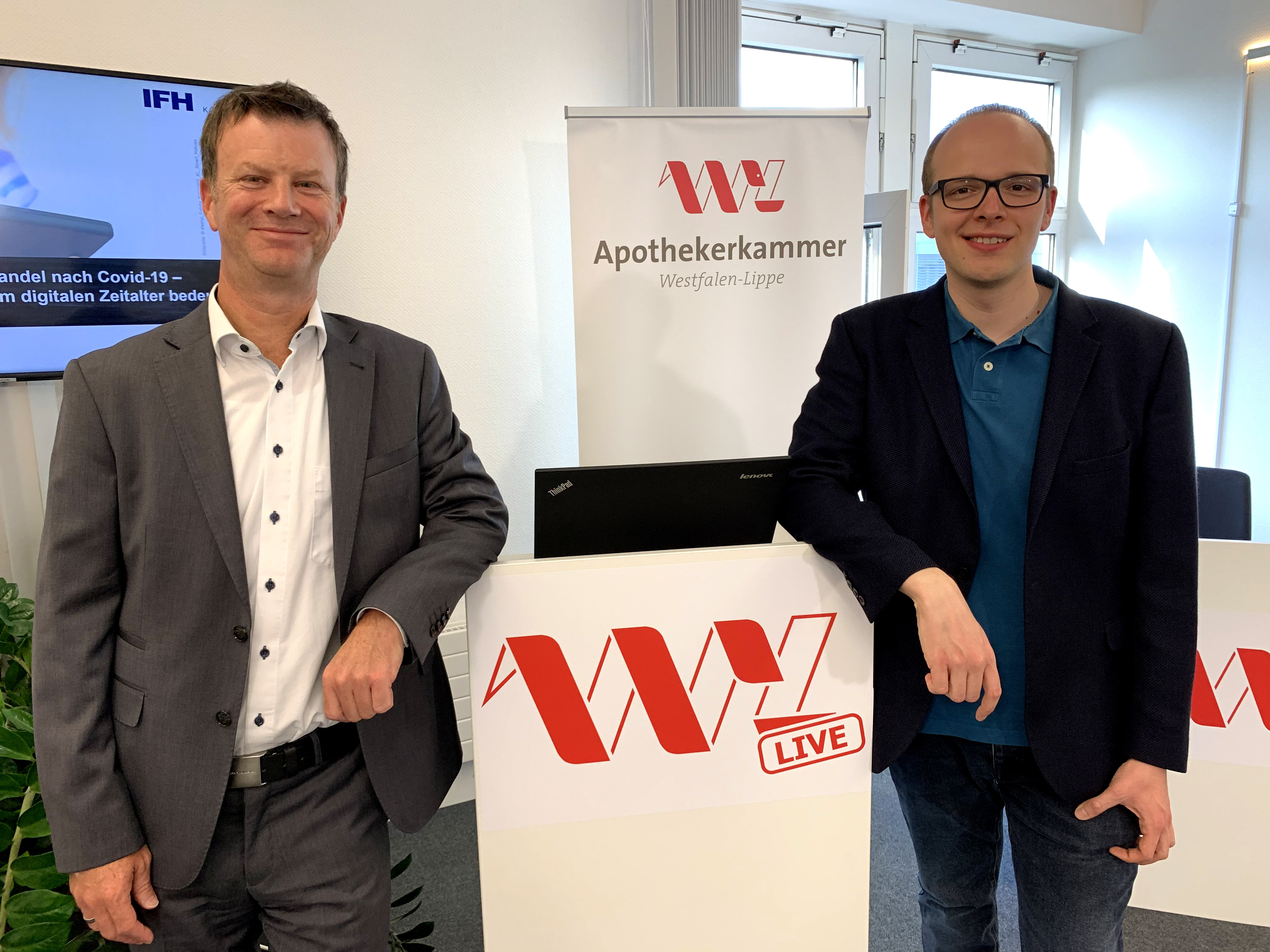 Wie verändert die Corona-Krise den Einzelhandel – und was bedeutet dies im digitalen Zeitalter für die Apotheke vor Ort? Diese Frage stand im Fokus der dritten Ausgabe von „AKWL-TV live“. Mehr als 200 Mitglieder und Gäste verfolgten den Live-Vortrag und die Diskussion von Dr. Kai Hudetz (Geschäftsführer des Instituts für Handelsforschung Köln) und Dr. Hannes Müller (Vorstandsmitglied der Apothekerkammer Westfalen-Lippe und der Bundesapothekerkammer) an den Bildschirmen, nahmen am begleitenden Online-Voting teil und stellten per Live-Chat ihre Fragen direkt an die Gäste im Studio. Moderator Matthias Bongard führte durch das 90-minütige Format.