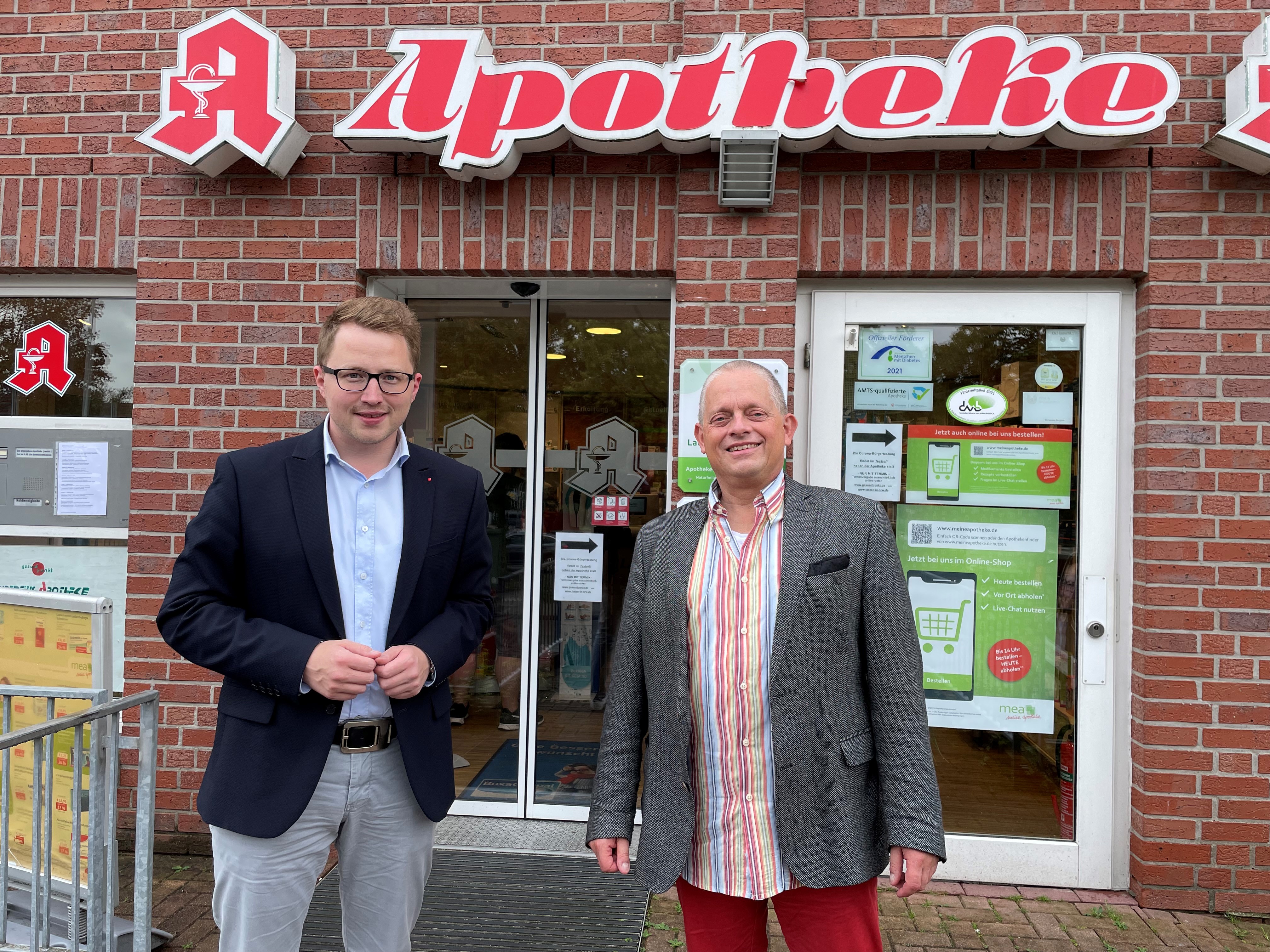Die Leistungen der Apotheke vor Ort – auch, aber nicht nur in der Pandemie standen im Zentrum des gestrigen Austauschs zwischen Dr. Stephan Barrmeyer, Sprecher der Apotheker*innen im Kreis Coesfeld, und Johannes Waldmann, Bundestagskandidat für den Wahlkreis Coesfeld-Steinfurt II. In Barrmeyers Laurentius-Apotheke (Coesfeld) nutzte Waldmann dabei die Gelegenheit, einen Blick hinter die Kulissen einer Apotheke zu werden.