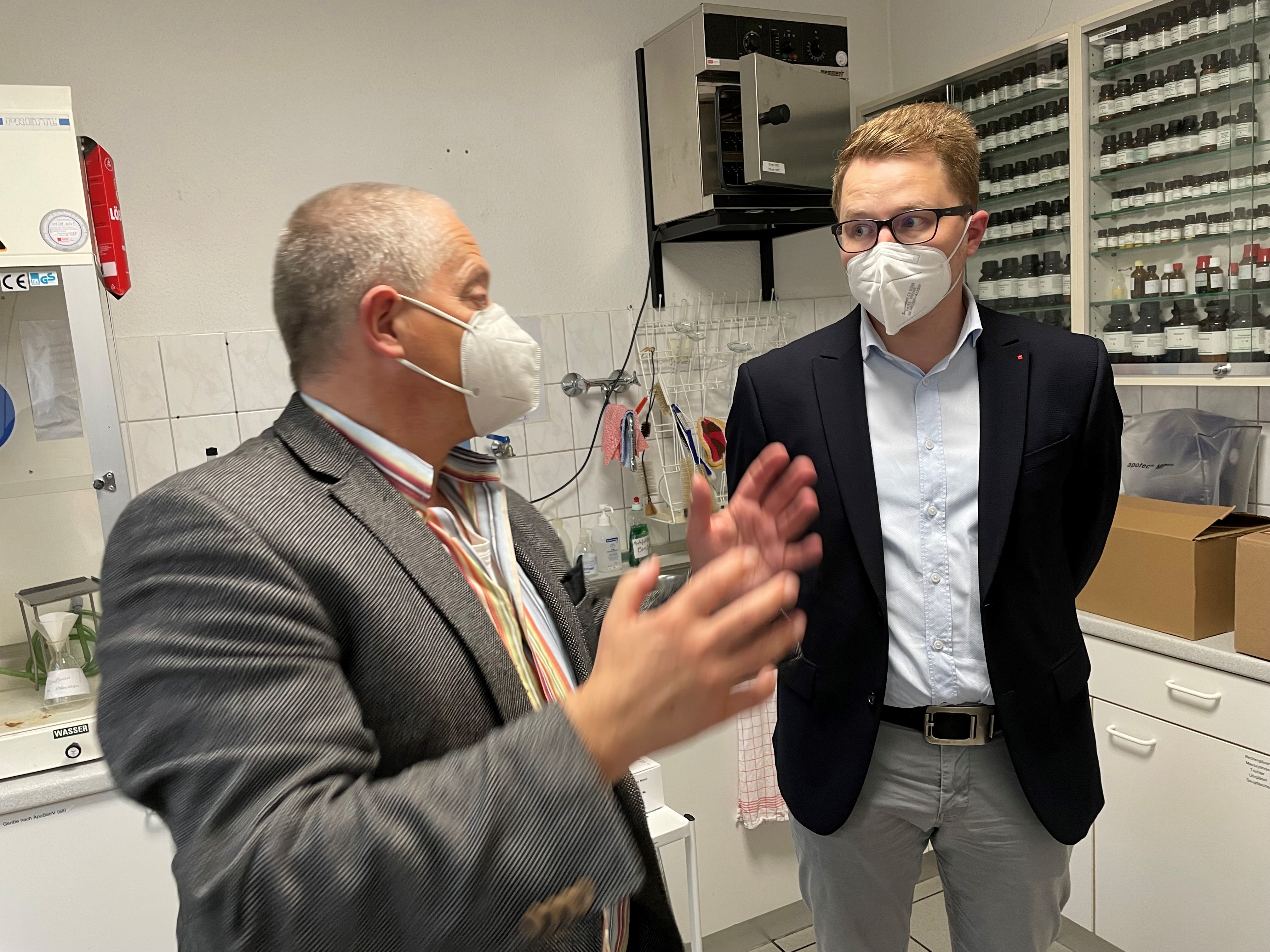 Barrmeyer beleuchtete, welche Bälle die Apotheken vor Ort während der Pandemie in der Luft halten mussten: von der Herstellung von Desinfektionsmitteln und die Abgabe unzähliger Masken an Risikogruppen über den massiven Arbeitseinsatz hiesiger Apotheker*innen und PTA im Impfzentrum und den Aufbau einer Testinfrastruktur bis hin zur Ausstellung der Covid-19-Impfzertifikate. Das beeindruckte SPD-Mann Waldmann: „Die letzten Monate haben wieder gezeigt, wie gut es ist, dass wir ein enges Apothekennetz haben.“