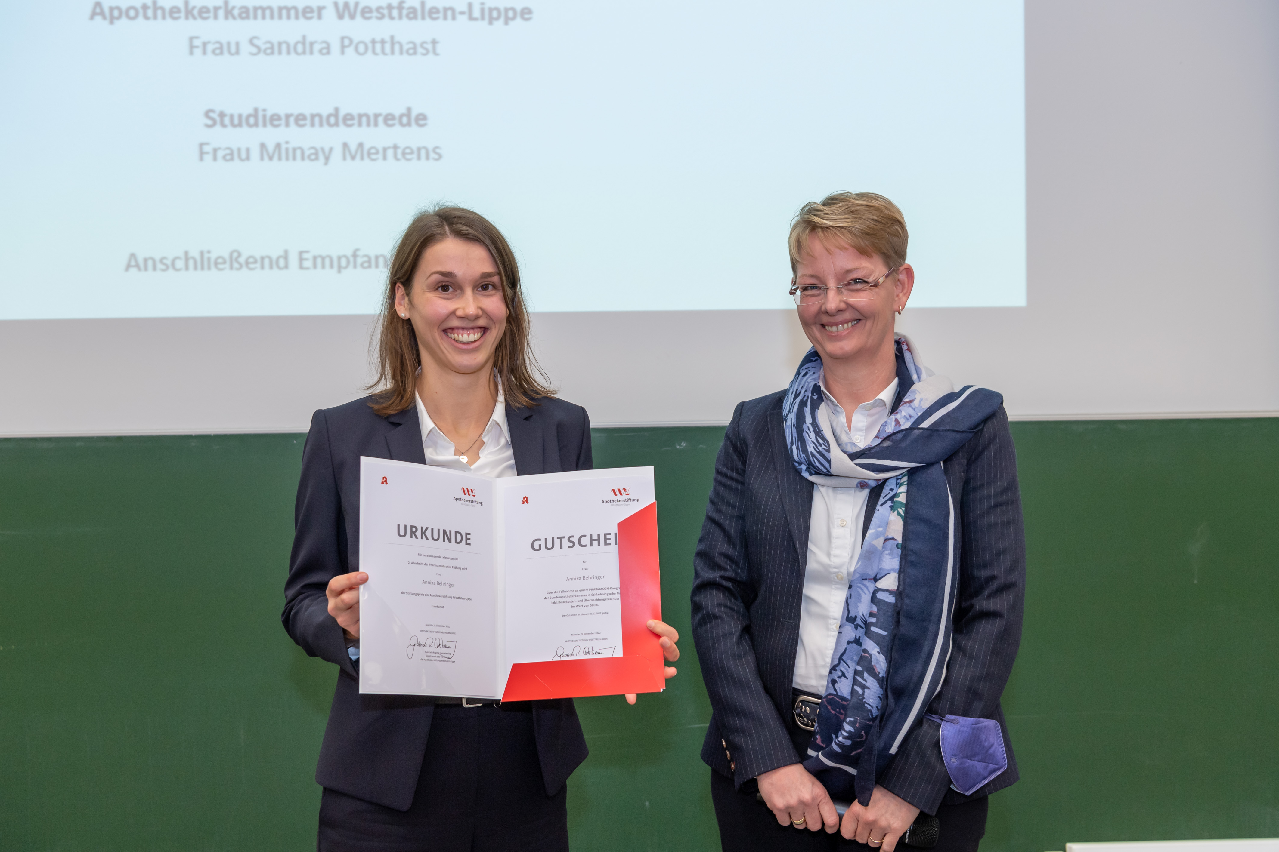Neben der Urkunde überreichte Sandra Potthast (Vorstandsmitglied der Apothekerkammer Westfalen-Lippe) der ausgezeichneten Jungpharmazeutin auch einen Gutschein für die Teilnahme an einer großen internationalen Pharmacon-Fortbildungsveranstaltung in Schladming oder Meran inklusive Reise- und Übernachtungskosten. Sandra Potthast lobte die herausragenden Leistungen der „Apothekerin in spe“ und richtete ihr Grußwort an alle diesjährigen Pharmazie-Absolvent*innen: „Wir sind unglaublich stolz darauf, dass Sie Ihr zweites Staatsexamen so souverän bestanden haben.“