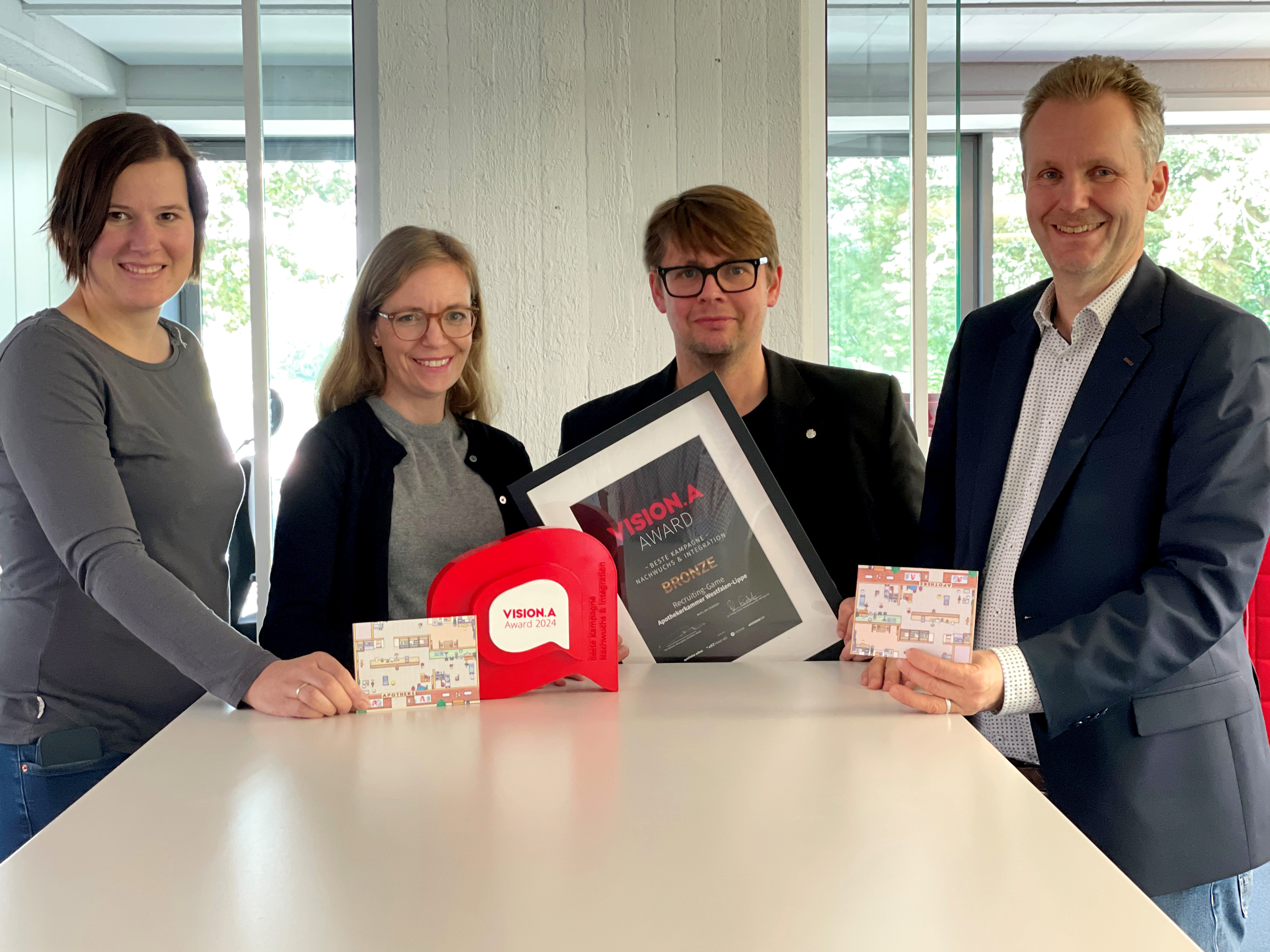 Im Team zum Erfolg: AKWL-Mitarbeiter*innen aus verschiedenen Bereichen haben am Recruiting-Game mitgewirkt (von links): Yvonne Schmees (Leiterin Stabsstelle Politik und Projekte), Birte Kassenbrock (Pressereferentin), Sebastian Sokolowski (Leiter Stabsstelle Presse- und Öffentlichkeitsarbeit) und Michael Schmitz (stellvertretender Hauptgeschäftsführer der Apothekerkammer Westfalen-Lippe) freuen sich über die erneute Auszeichnung mit dem Vision.A-Award in Bronze.